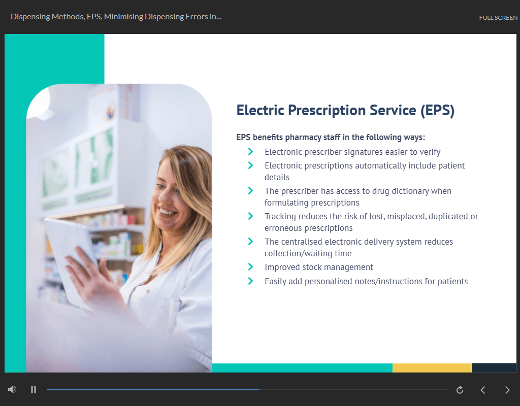 | Module 7: Dispensing Methods, EPS, Minimising Dispensing Errors in Pharmacies | 00:16:00 | ||